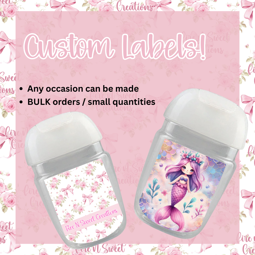 These are labels for bottles of hand sanitizer. No bottles or sanitizer included. Please email me if you have a preferred image or logo you like used. Thank you. No returns or refunds once product has been made. Must give 1 week for processing and around 3 days for shipping. Brings 40 Labels.